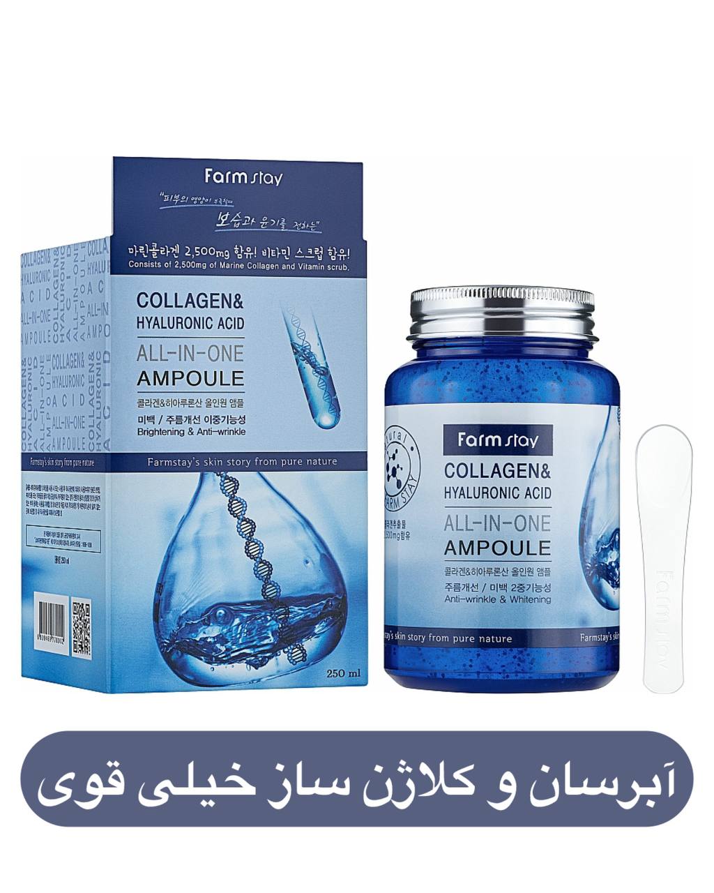 آمپول کلاژن و هیالورونیک اسید farm stay بهبود خطوط و چروک ریز و جلوگیری از ایجاد علائم پیری ( دارای ترکیبات ریز و غلیظ با قدرت جذب بسیار بال ا) حجم 250 میل ساخت کره