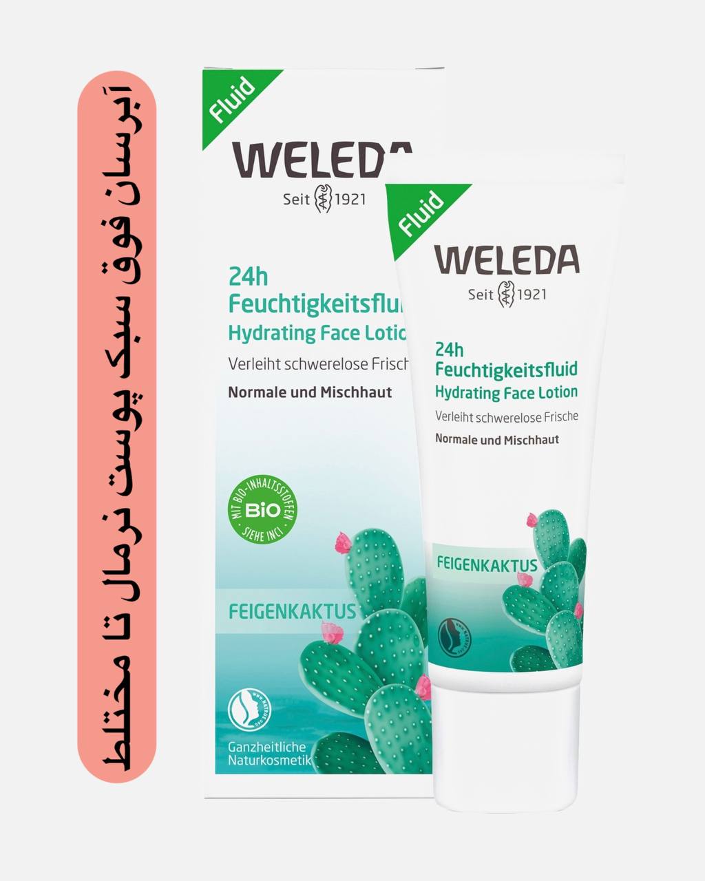 لوسیون آبرسان فوق سبک 24 ساعته صورت weleda مخصوص پوست های معمولی و مختلط حاوی آب کاکتوس و گلابی حجم 30 میل ساخت آلمان